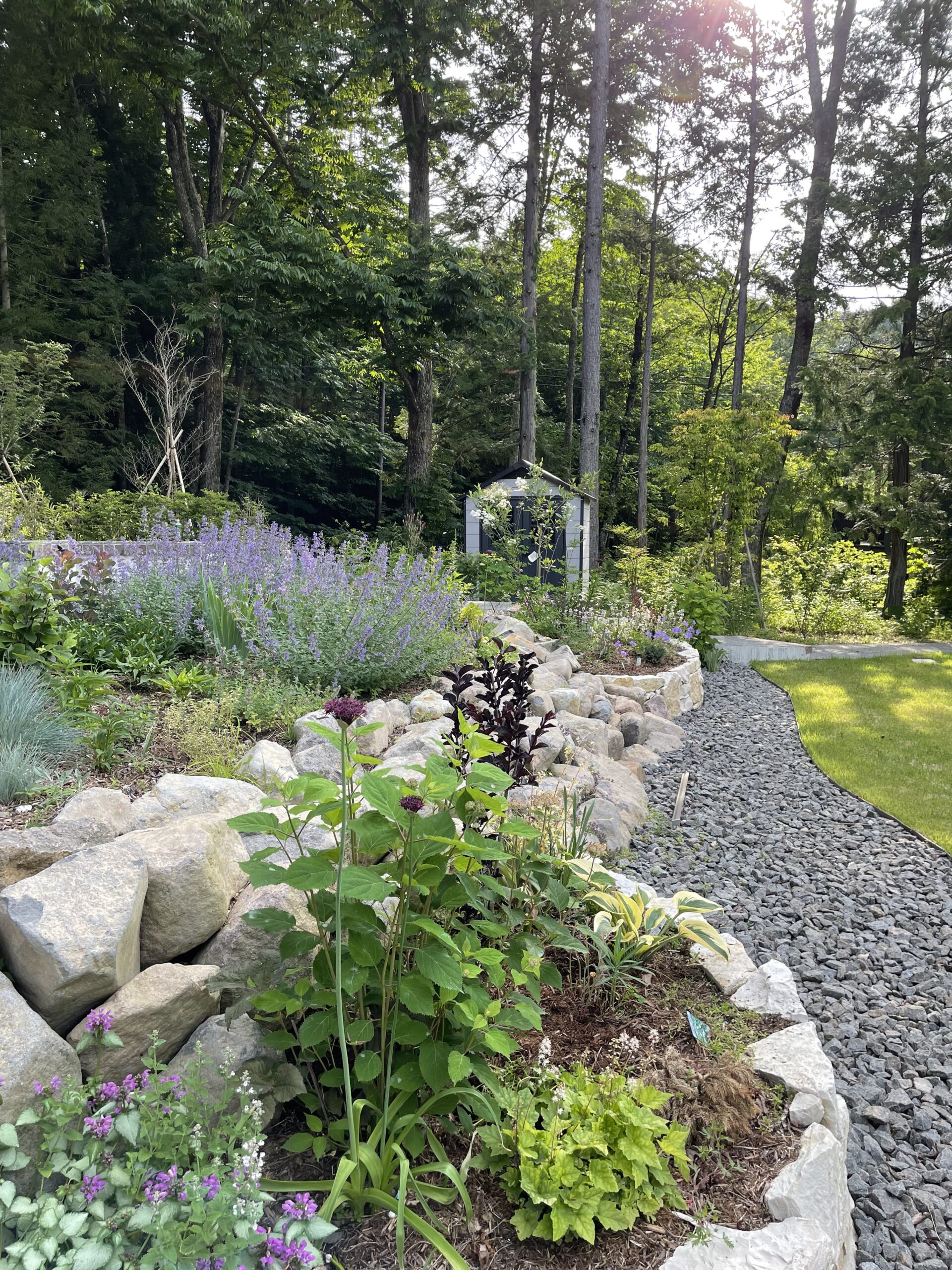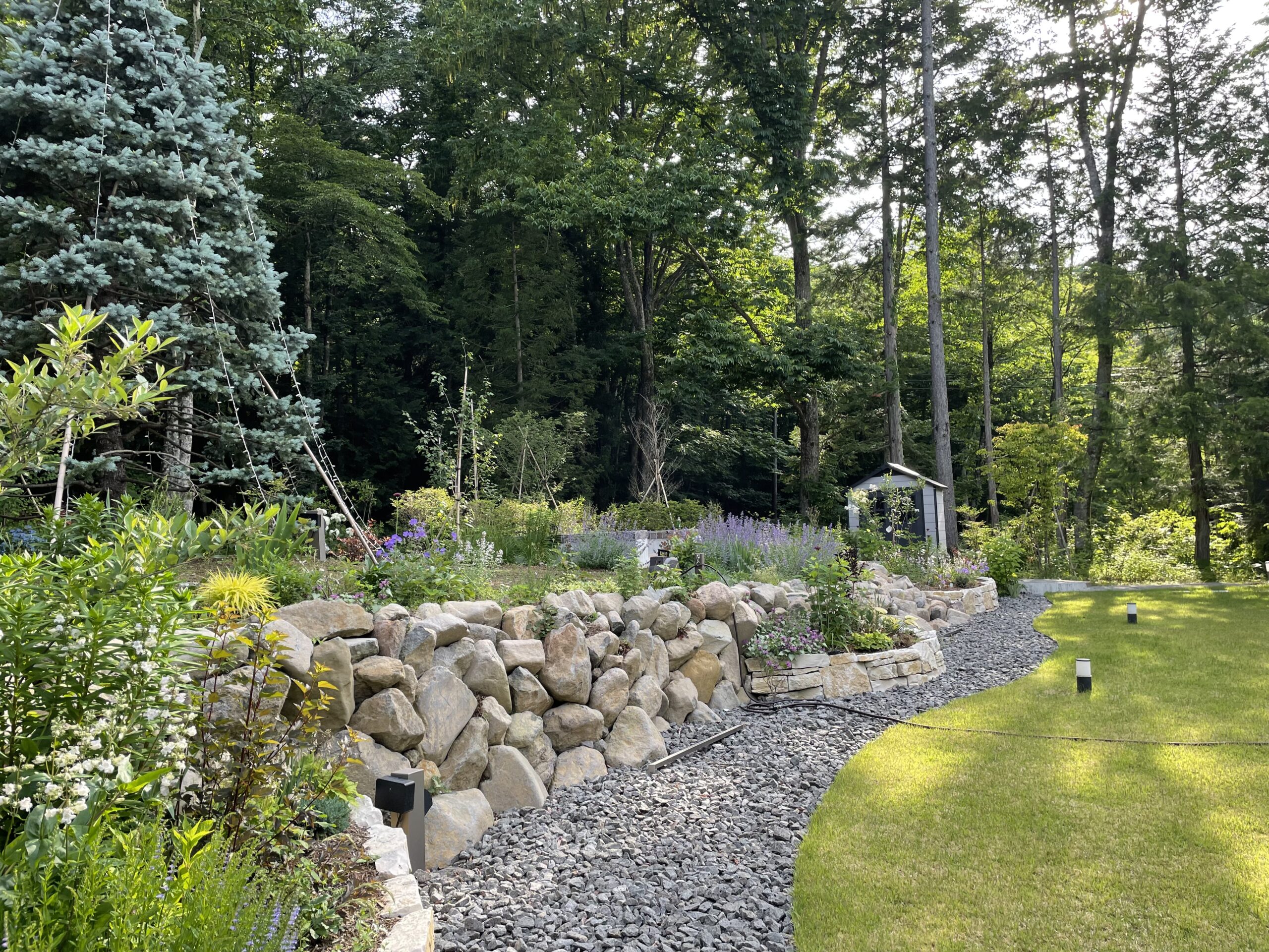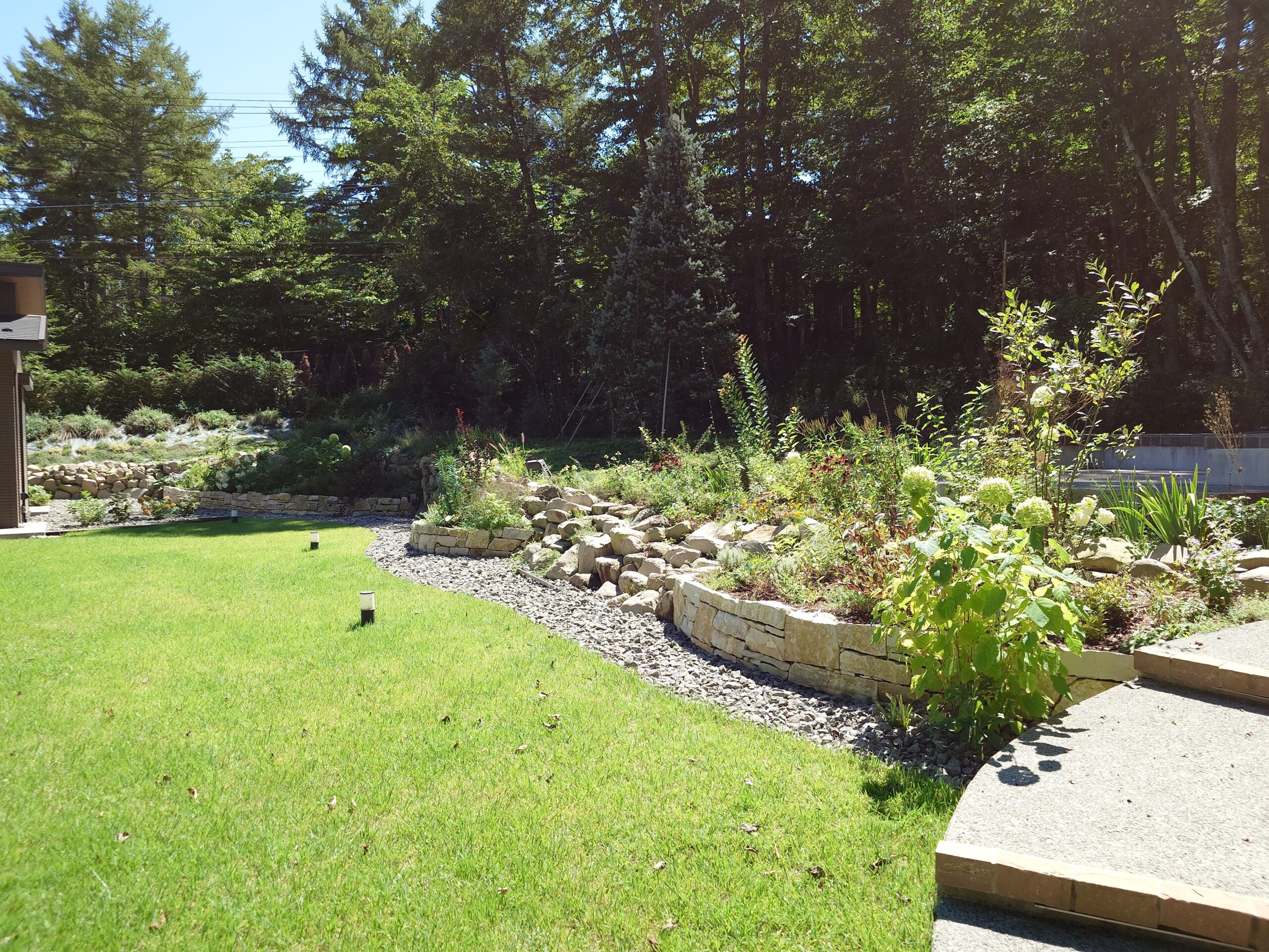 自然あふれる周囲の環境。その中で心地の良い居場所がある、そんなお庭をデザインさせていただきました。とても広く、かつ傾斜の付いた土地柄もあり、高低差を活かしたお庭となっています。前景は広い芝庭、中景は宿根草をメインとした花壇や植栽帯を配置し、自然の借景と手入れの届いた芝庭をつないでいます。このグラデーション構造が自然と庭をつなぎ、居心地の良い空間を演出しています。また、中景に当たる植栽帯の中へ焚火スペースを設け、自然とお庭、その両方を眺めることが出来るようになっています。