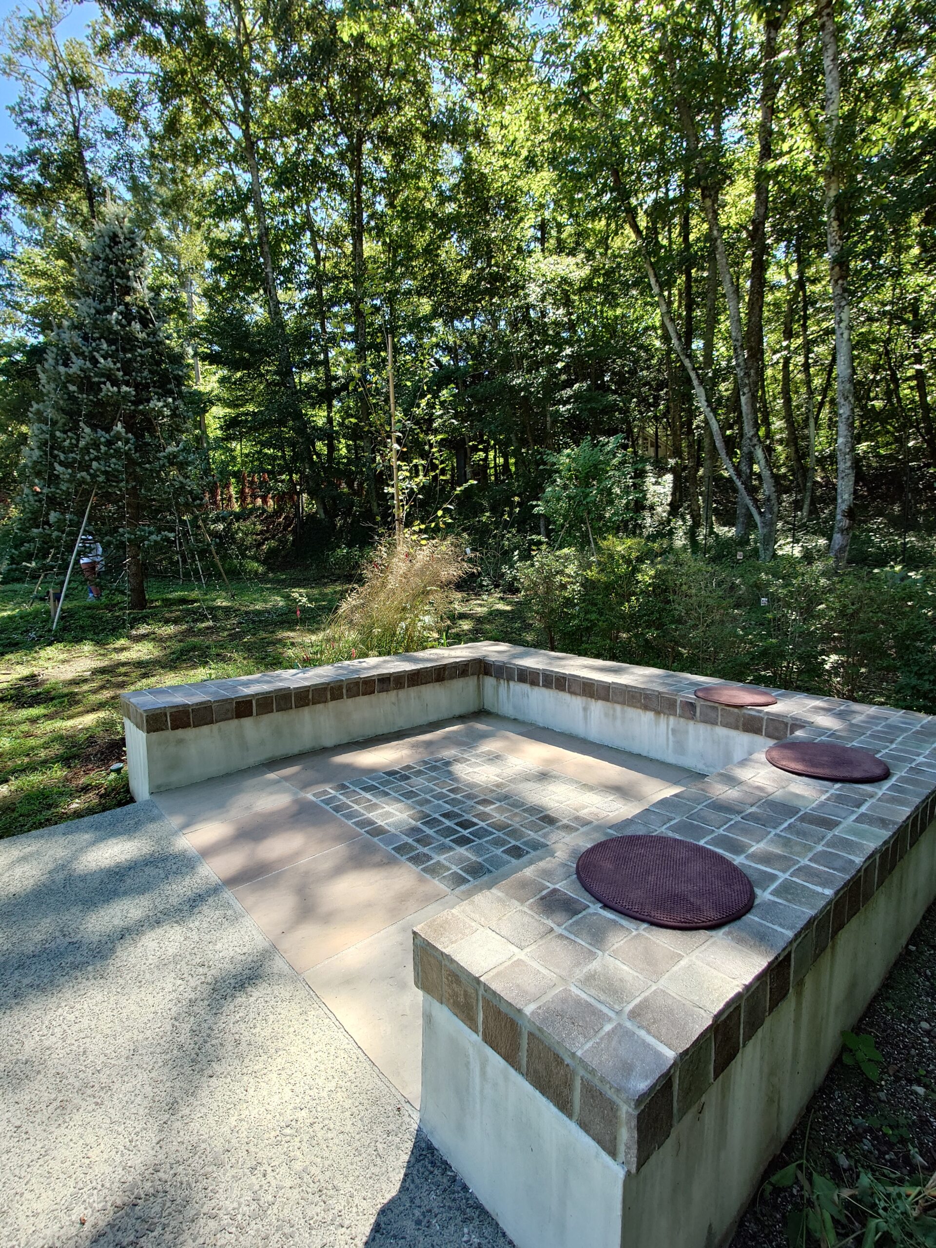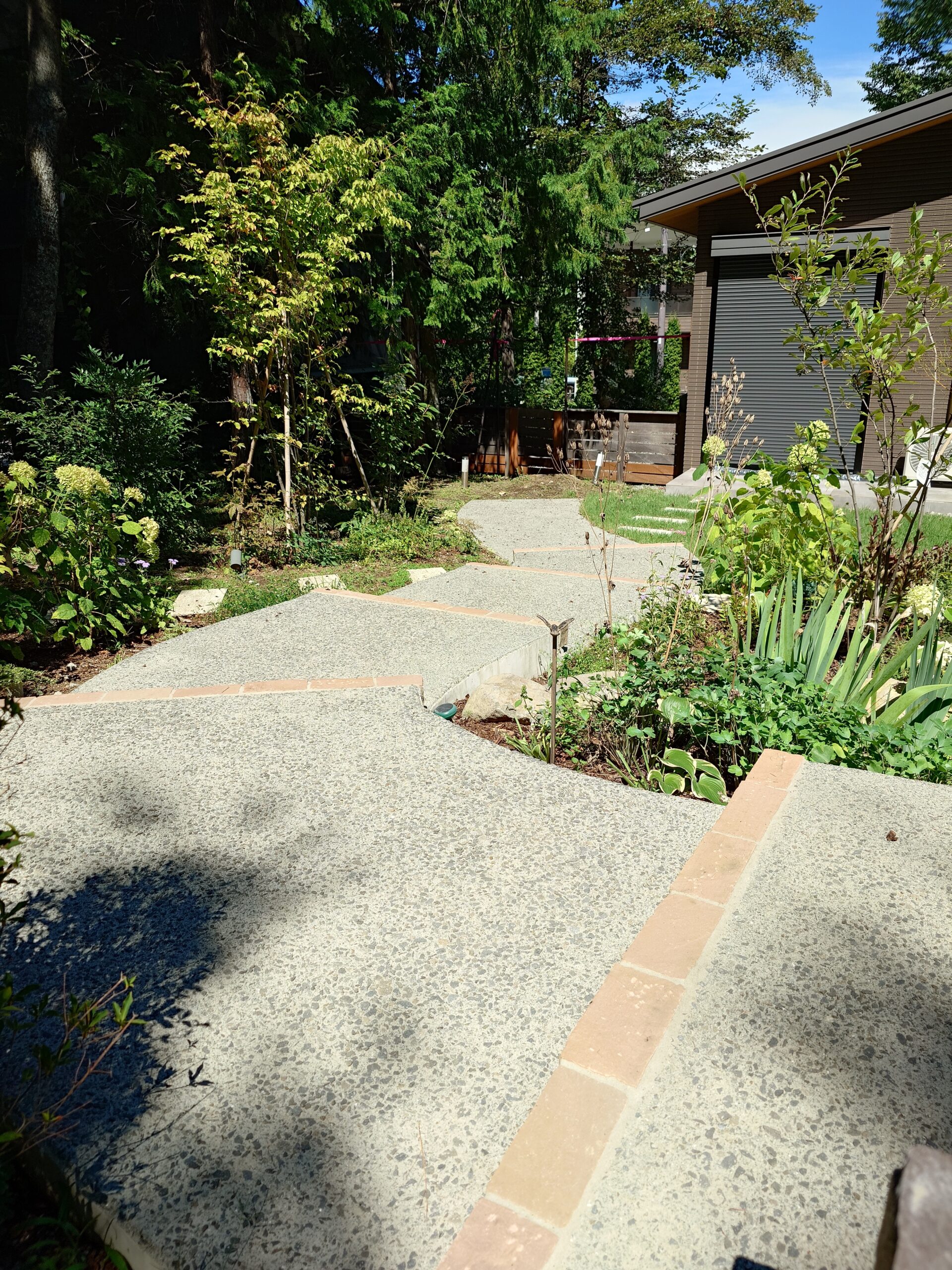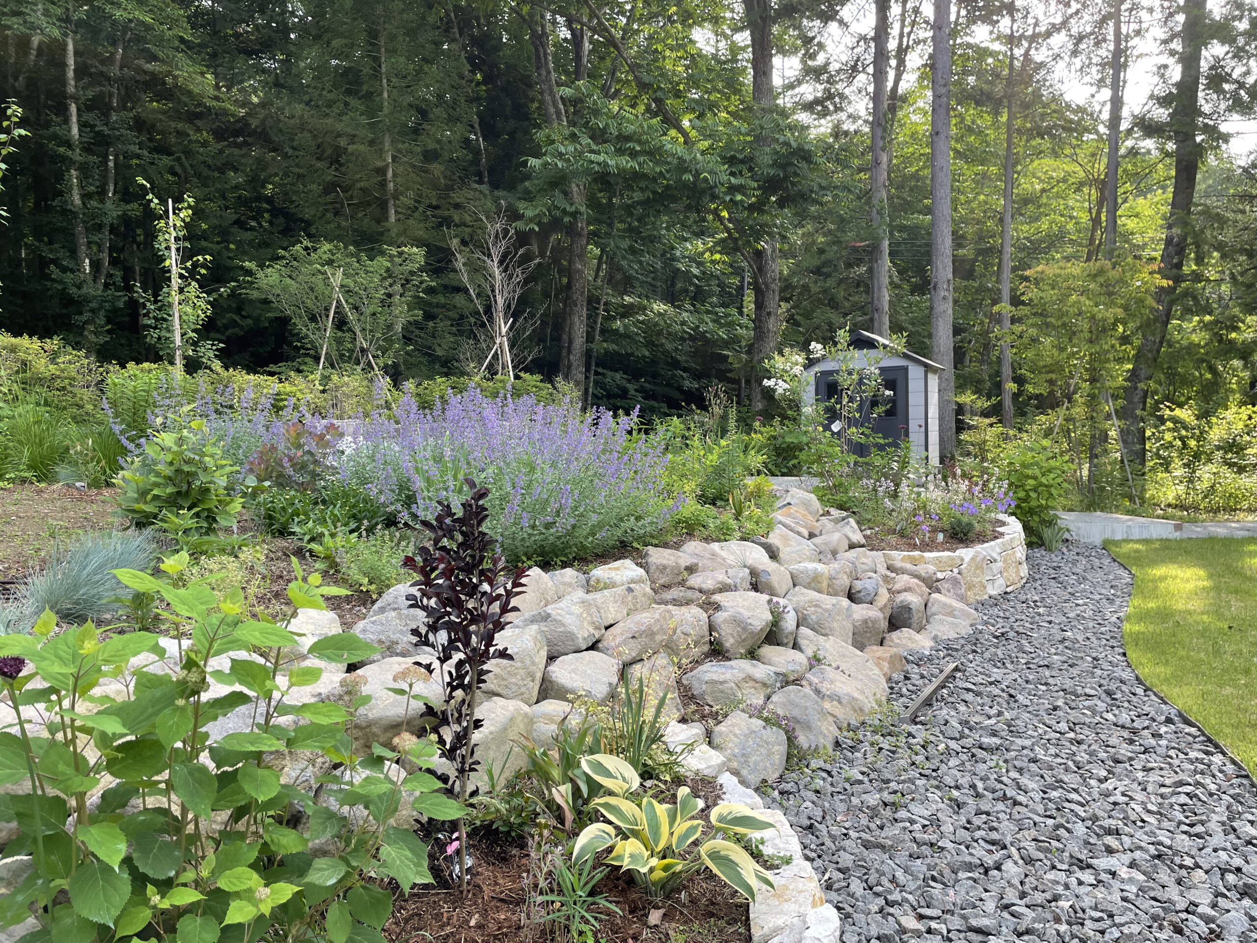 自然あふれる周囲の環境。その中で心地の良い居場所がある、そんなお庭をデザインさせていただきました。とても広く、かつ傾斜の付いた土地柄もあり、高低差を活かしたお庭となっています。前景は広い芝庭、中景は宿根草をメインとした花壇や植栽帯を配置し、自然の借景と手入れの届いた芝庭をつないでいます。このグラデーション構造が自然と庭をつなぎ、居心地の良い空間を演出しています。また、中景に当たる植栽帯の中へ焚火スペースを設け、自然とお庭、その両方を眺めることが出来るようになっています。