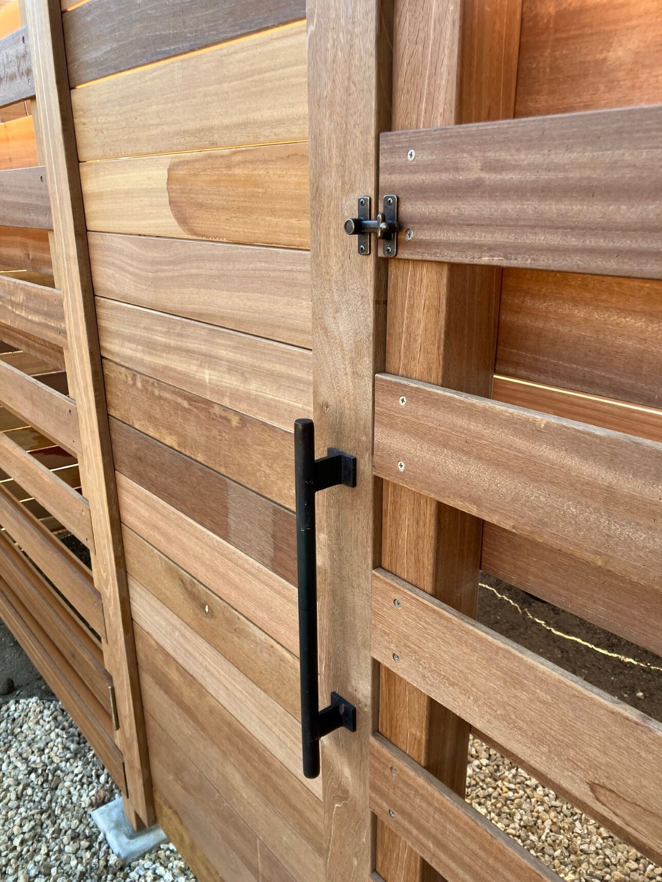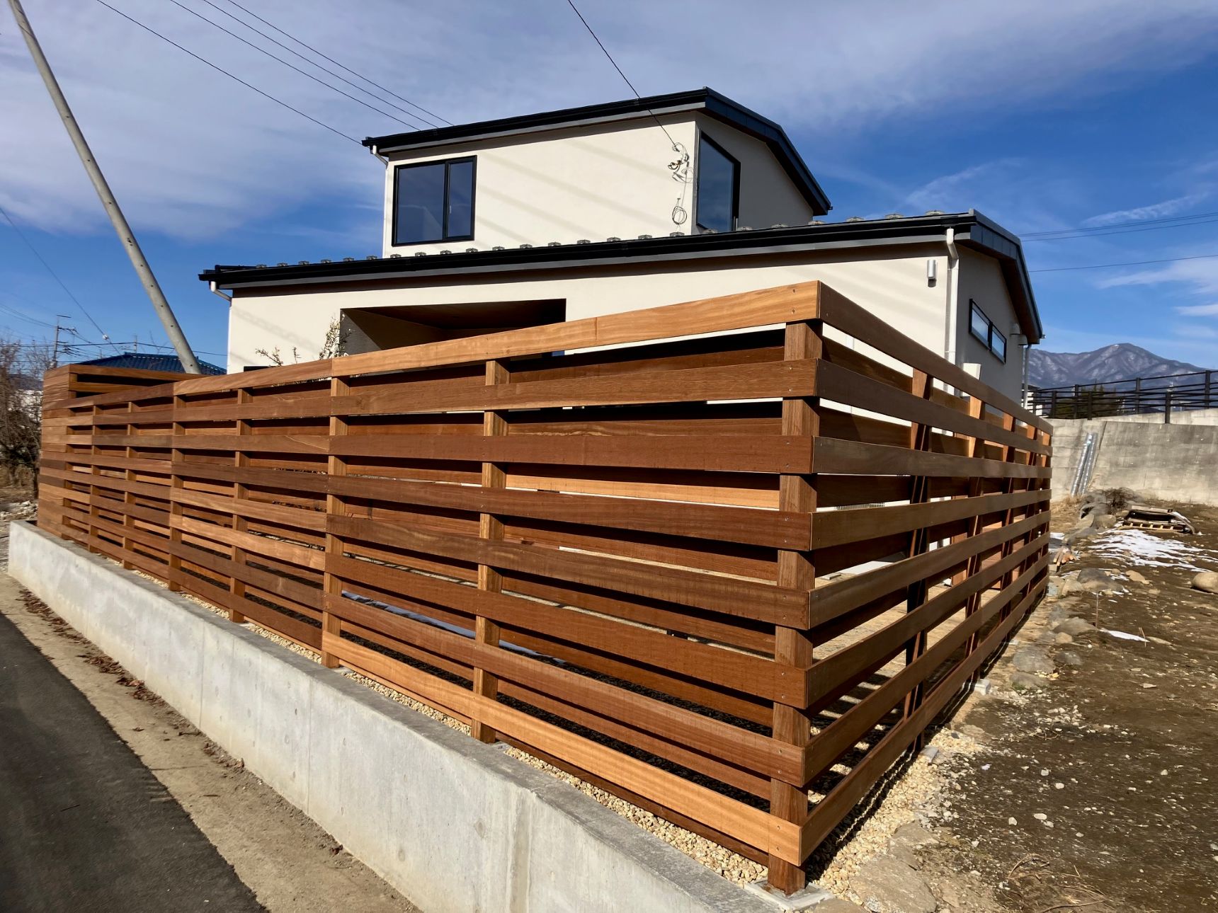 プライベート確保のための、道路・境界際のフェンス。内扉に開き留めの小物を設置。扉を閉じていても楽しめるワンポイント。
